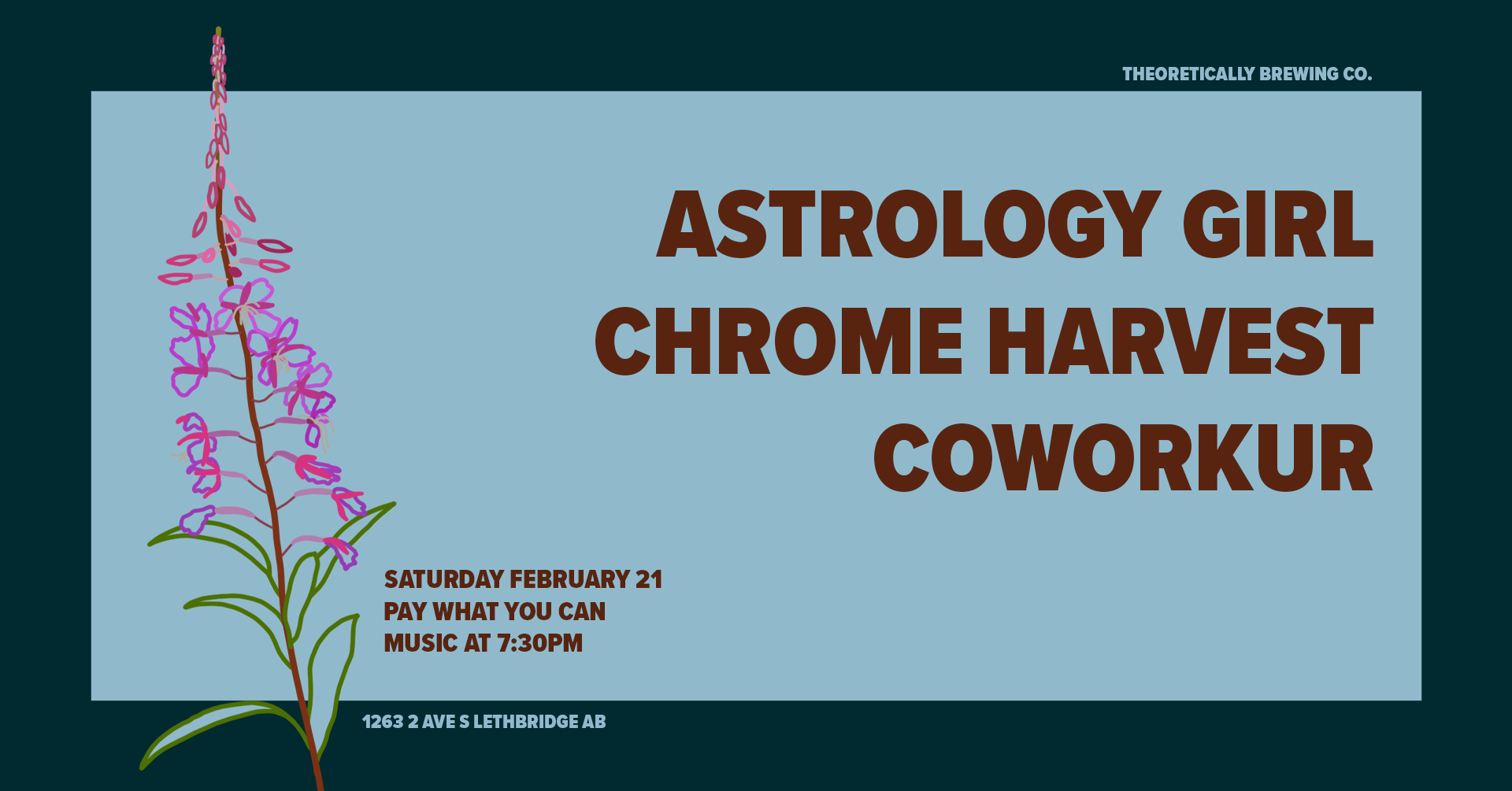 Come on down to the Brewery on Saturday February 21, 2026 for a night of live music with Astrology Girl, Chrome Harvest, and CoWorkur!